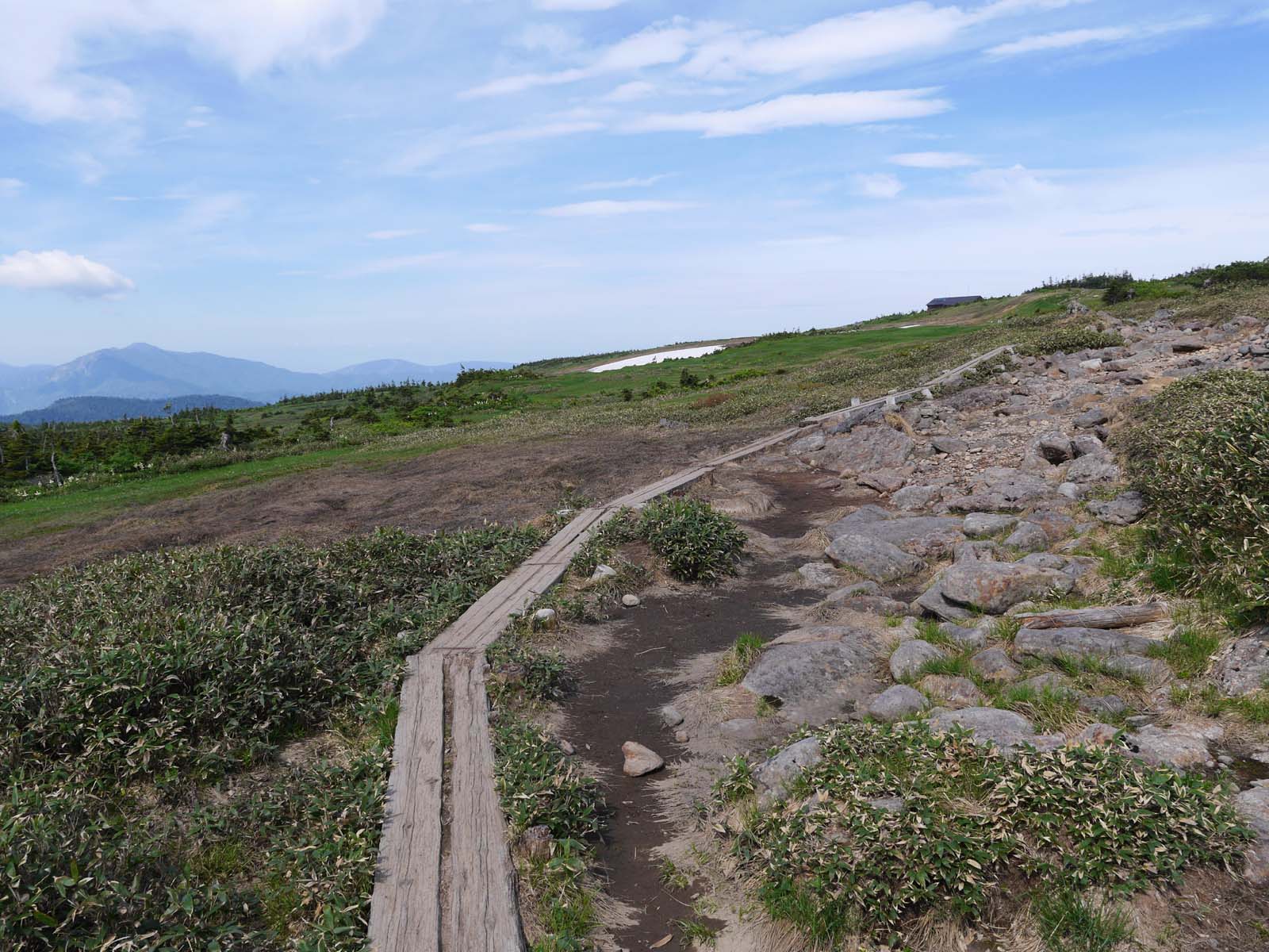 | 苗場山頂上ヒュッテ裏の展望台からの眺め。 | 頂上の湿原の木道を散策します。 | まだ木道が雪に埋もれているところもあります。 | 頂上湿原です。 | 苗場神社まで来ました。 |
