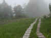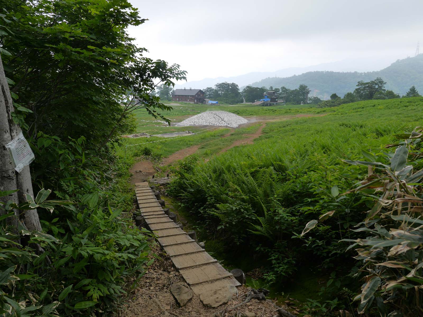 | ガスに煙る中の芝。 | 下の芝。 | ようやく和田小屋が見えてきました。 | 登山道を振り返ります。苗場方面はガスの中になってしまいました。 | やっと駐車場に戻りました。 |