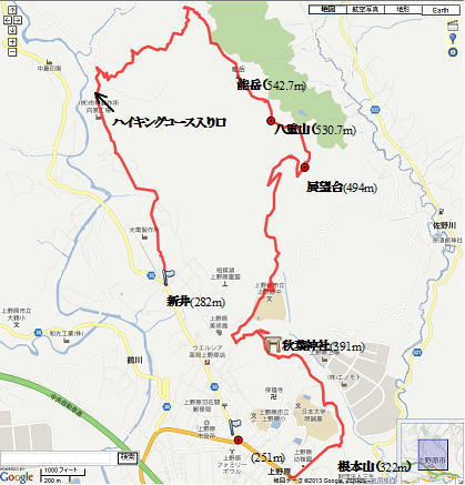 | 歩いた道。google mapに加筆。 | 歩いた道の標高。高低差300m程度です。 |