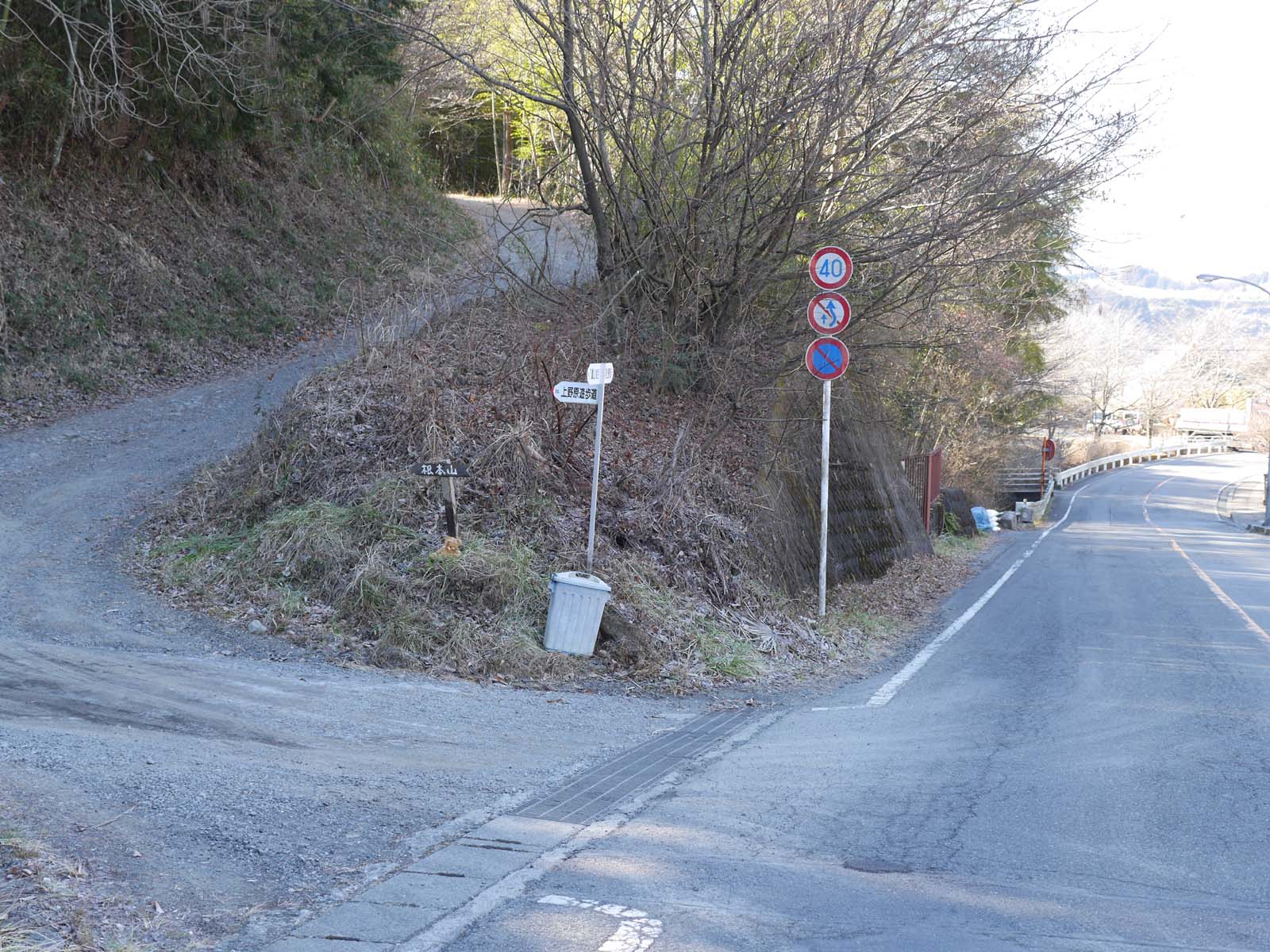ハイカーは自分だけのようです。7時35分出発。新井から歩いて行くと、まず虎丸山ハイキングコースの分岐があります。途中左側に富士山が見えるところが何カ所かあります。さらに歩いた向風(むかぜ)までバス亭はあるのですが、1日に1便だけのようです。向風のバス亭から少し歩いて橋を渡ると、右にハイキングコースが分岐するので、ここからハイキングコースに入ります。