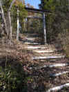 | 鳥居と東屋。 | 上野原市の水道タンク。 | 広い道から別れ、この尾根を登ると展望台。 | 展望台からの展望です。下は日大明誠高校。 | 根本山(322m)です。東屋の間に富士山が見えます。 |