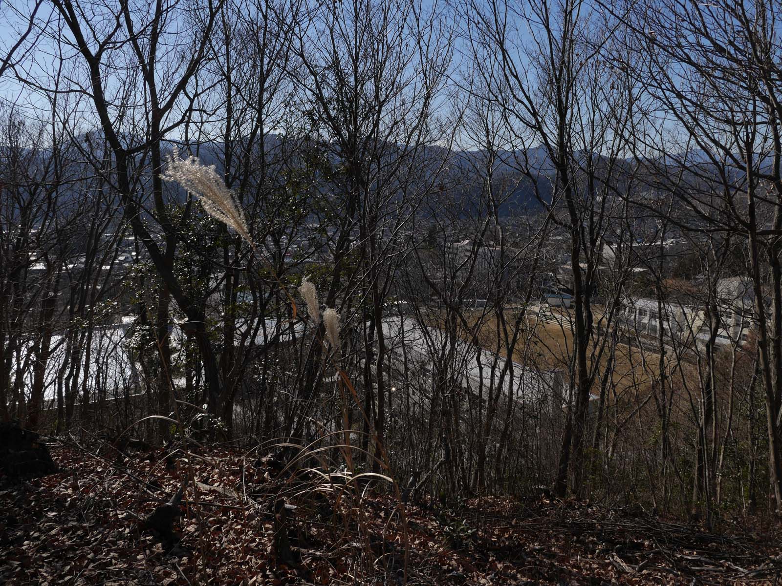 少し車道を下ると左に根本山の表示があります。そこを少し登るとお墓に出ます。しつこいくらいにたくさんある根本山の表示に従って歩くと、お墓を左回りに巻くように登り、秋葉神社下の東屋に出ます。ここも展望がありますが、秋葉神社(秋葉山、391m)に登った方がもっといいでしょう。三角点もある秋葉神社には電波塔も立っています。登ってきた方向をそのまま行くと階段があります。たぶんこれを下りても大丈夫だろうとは思いましたが、一応元の東屋へ戻りました。
