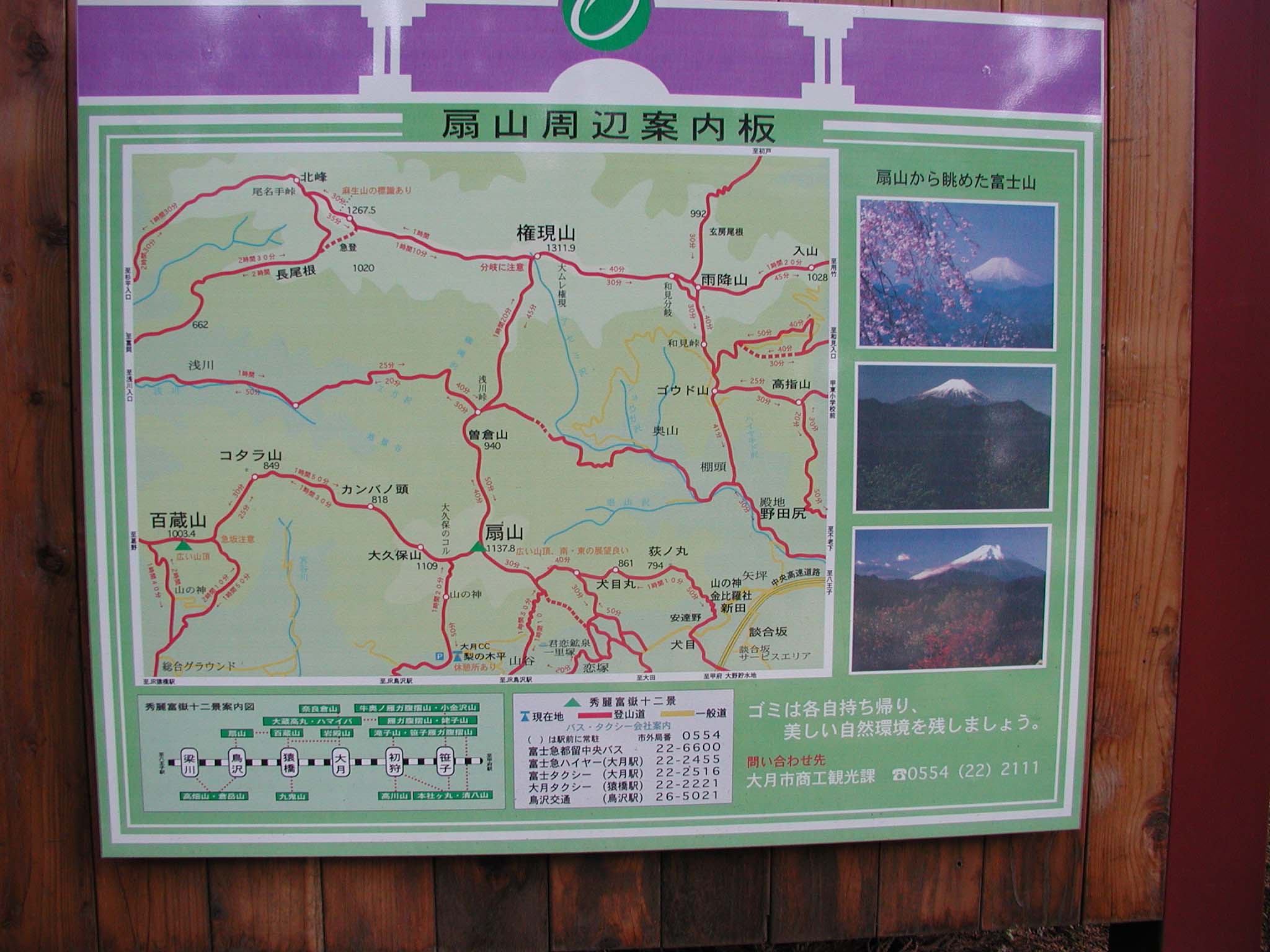 2003年5月6日(火)、扇山に行ってきました。JR中央本線高尾発6時15分の松本行き普通電車に乗りました。列車に乗るのは久しぶりです。列車に乗るのはなんだか楽しい。とはいっても、鳥沢駅(高尾から480円)は近い。6時40分ころには着いてしまいました。本当はこのあたりから見ると、扇の形をしている山です。この日ははまったく見えません。7時前から歩き始めます。
