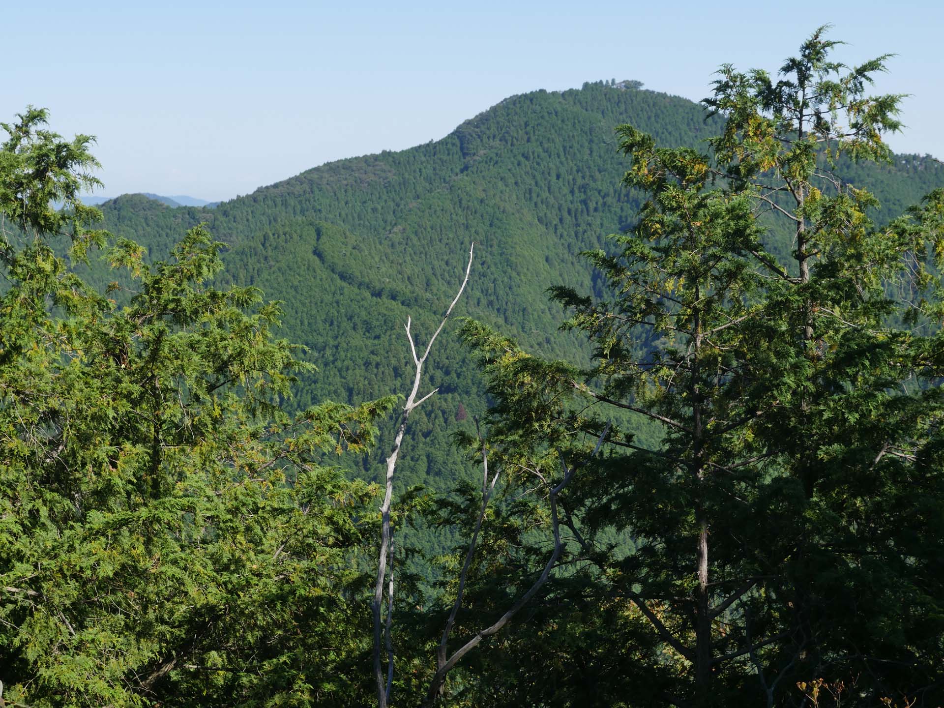 11時15分に新高岩山の展望台に到着です。ここは四阿兼展望台が設置されています。先に親子4人(両親と女の子2人)のグループがくつろいでいました。お腹がすいたのでのこちらも食事。今日もカップラーメンです。食事しているうちに、芥場(あくば)峠の方から女性二人組もやってきて、ビール付きの豪華な食事が始まりました。快晴なのですが、関東平野はスモッグに覆われて都心はまったく見えませんでした。それでも、近くは非常によく見えます。大岳山荘は見えませんが、その下の宗教施設(?)は見えました。