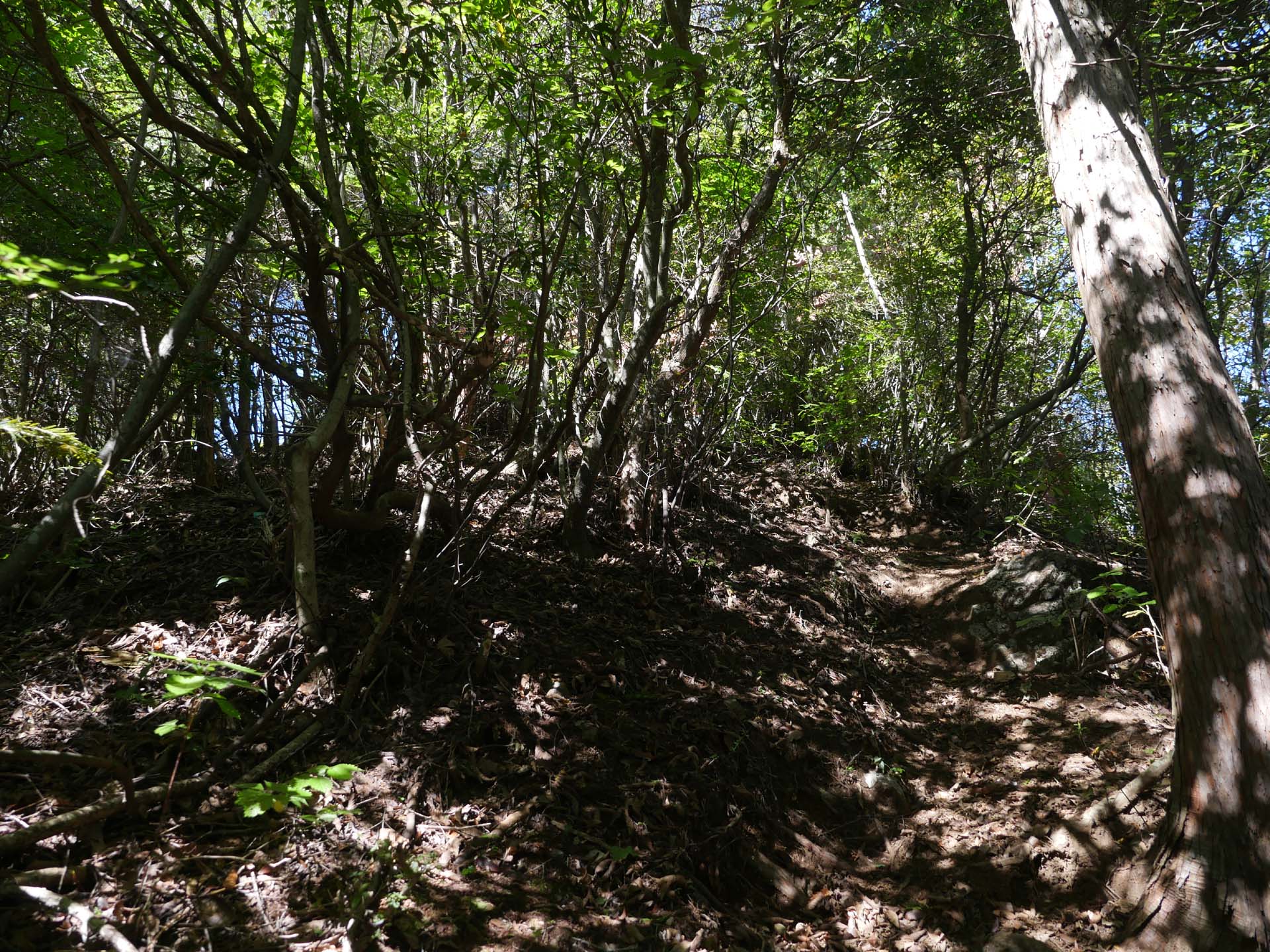 芥場峠へは尾根道と巻き道があります。巻き道をとりました。芥場峠でメインの登山道と合流します。ここからは大勢の登山者と会うことになります。大岳山荘までは、急な登りもない道です。ただ、途中で「滑落注意」の看板があったりもします。かつて事故が起きたのでしょう。