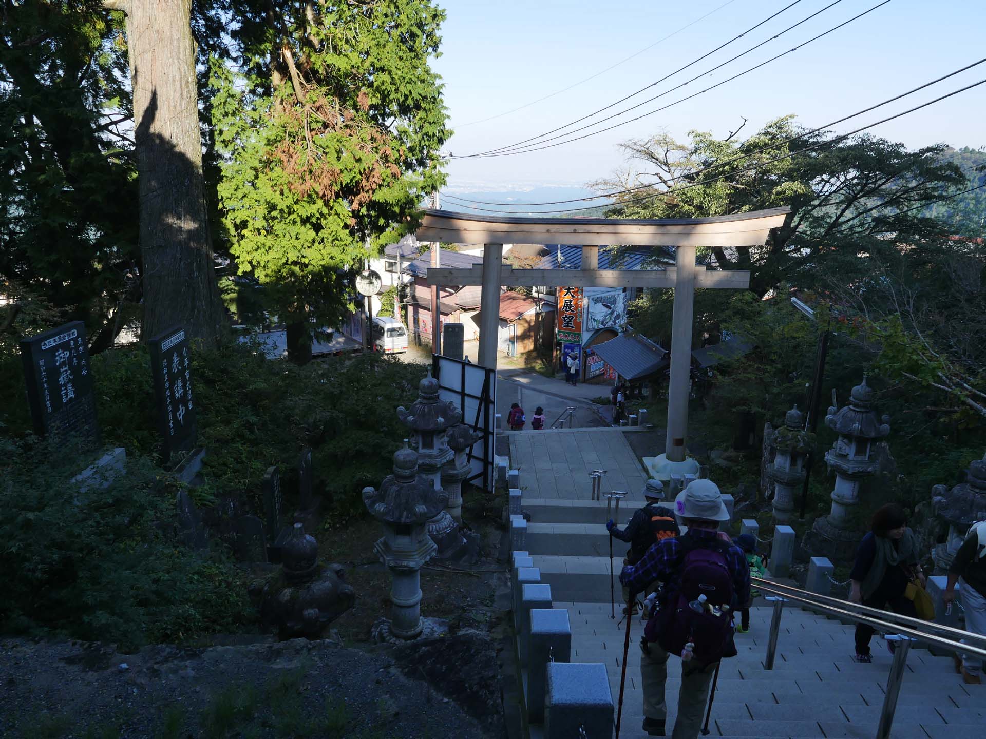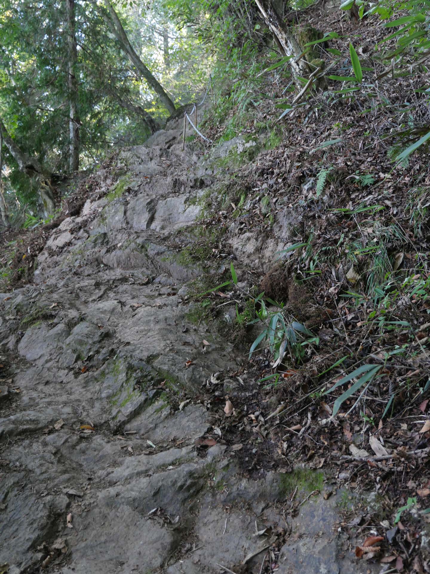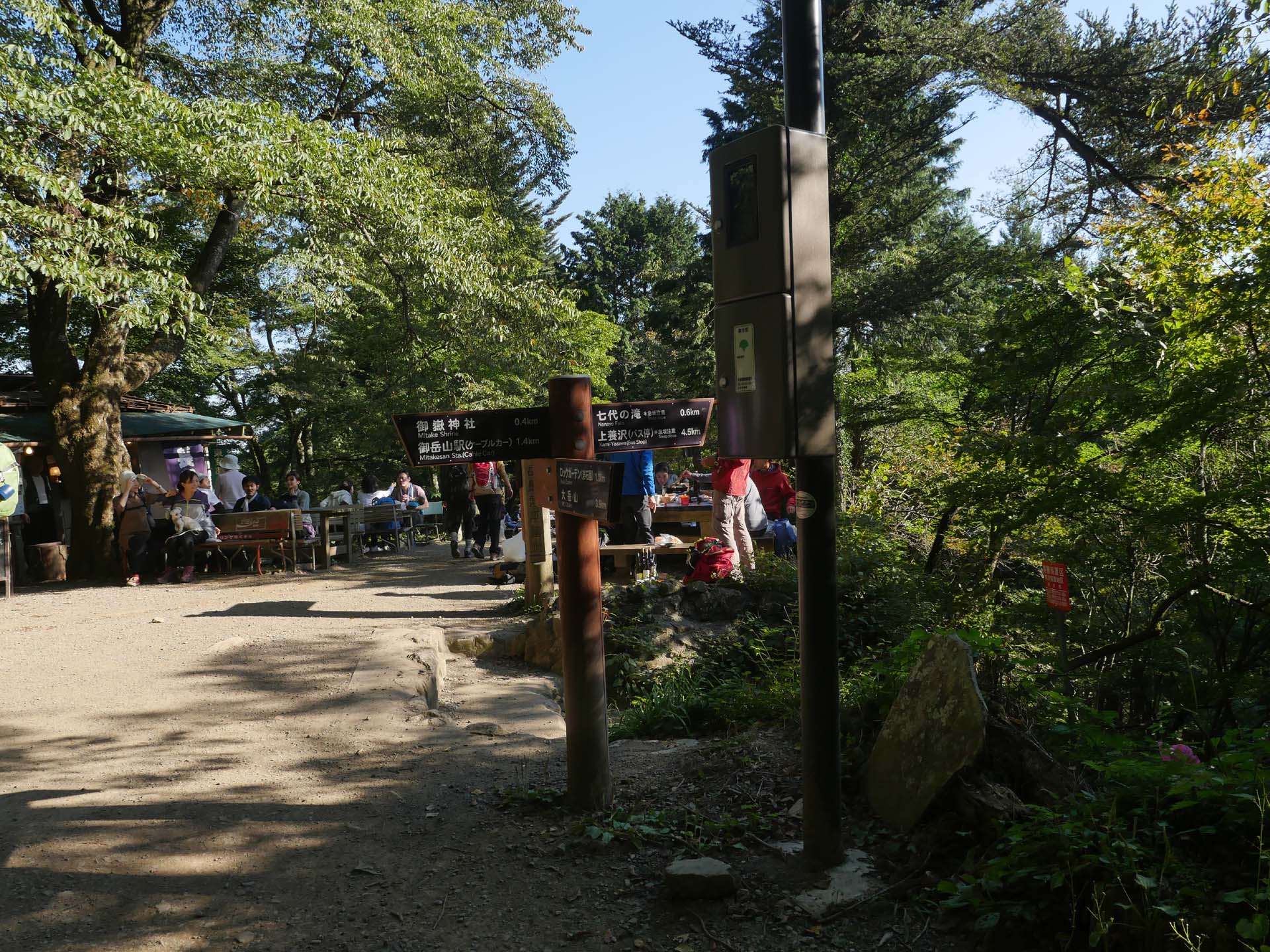写真などを撮ったあと、13時10分、下山を開始しました。大岳山荘までの岩場では、ところどころで渋滞になっていました。大岳山荘まで降りれば、あとは緩い下りで芥場峠まで。峠から沢までは少し急なつづら折れの道。ここを降りきればまた平坦な道、所により少し下りという感じでです。こうした道が長尾平入り口から御嶽神社の階段下まで続きます。