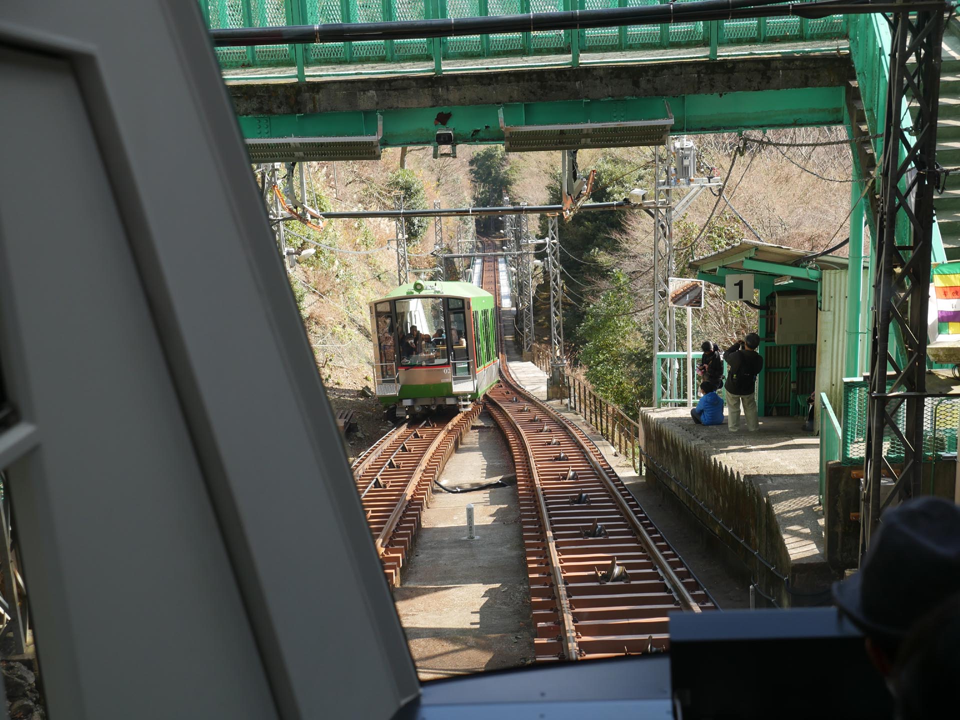 阿夫利神社には12時35分に到着。急な下りの連続で膝がとてもつらい。とてもコースタイムでは歩けません。ここからの下りはケーブルカーを使いました。窓の大きな新車両になっていました。