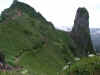 9時15分に三眺山。名前の通り眺めがいい場所です。圧倒的な迫力の利尻山。でもまわりは可憐な花です。コースはここから核心の背負子投げから親不知子不知の難所になります。一応危険なところは補助ロープが張ってあります。まず、背負子投げの岩場を降ります。あとはトラバース気味に親不知子不知のガレ場を通過。まだ登山者は少ないので、落石の危険は余りありません。そのあとは崖みたいなところをよじ登ります。よじ登ったところで鴛泊コースと合流します。10時20分になっていました。
