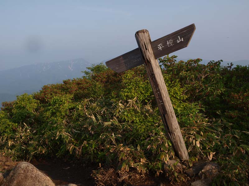 平標山山頂に着いたのは7時15分。天気はいいのですが、空気が霞んでいて展望がききません。谷を挟んだ苗場山も霞んでいます。そのまま通過して、仙の倉山をめざすことにしました。山頂の東側(仙の倉側)は見事なお花畑です。木の階段が多い道をひたすら歩いて仙の倉山へ。山頂到着は8時でした。先に二人の登山者がいました。平標山の家側から登ってきたようです。本来は展望がいい山らしく、山頂には方位版もありましたが、雲も出てきたのでほとんど展望はありません。少しだけ頂上にいて戻ることにしました。