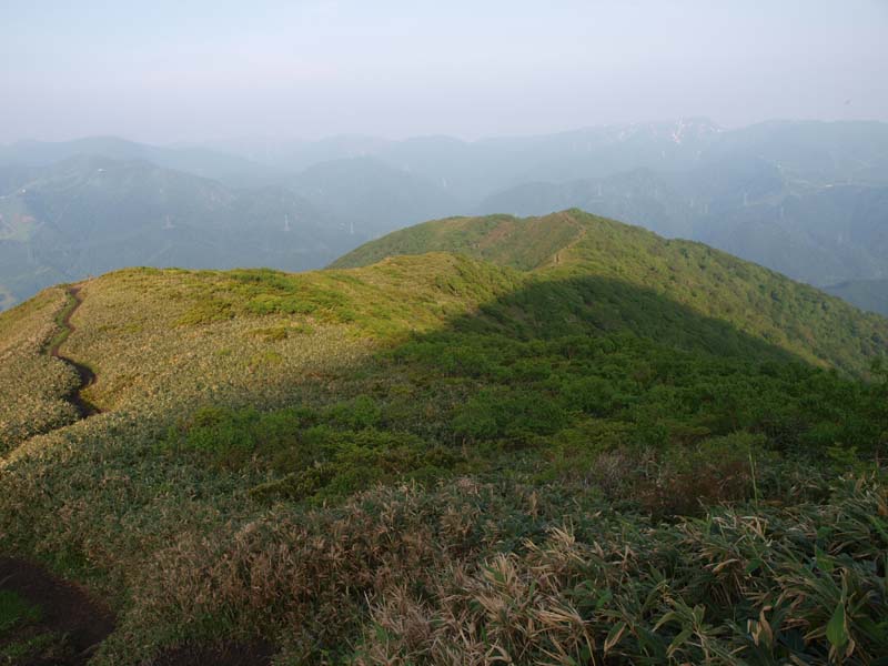 まず第1目標の巨大鉄塔(たぶん柏崎刈羽原発からの送電線)をめざします。鉄塔までは急登です。鉄塔近くでクロコウガイビルを見ました。鉄塔で小休止。暑くなってきたので長袖シャツを脱ぎ、Tシャツとベストスタイルになります。鉄塔からは少しは急登もありますが、だいたい緩傾斜の尾根道です。松出山は標識がないとそれとわからない程度のピーク。そのまま通過して平標へ。この辺から花が増え始めます。頂上近くは植生を保護するための木の階段が多くなります。