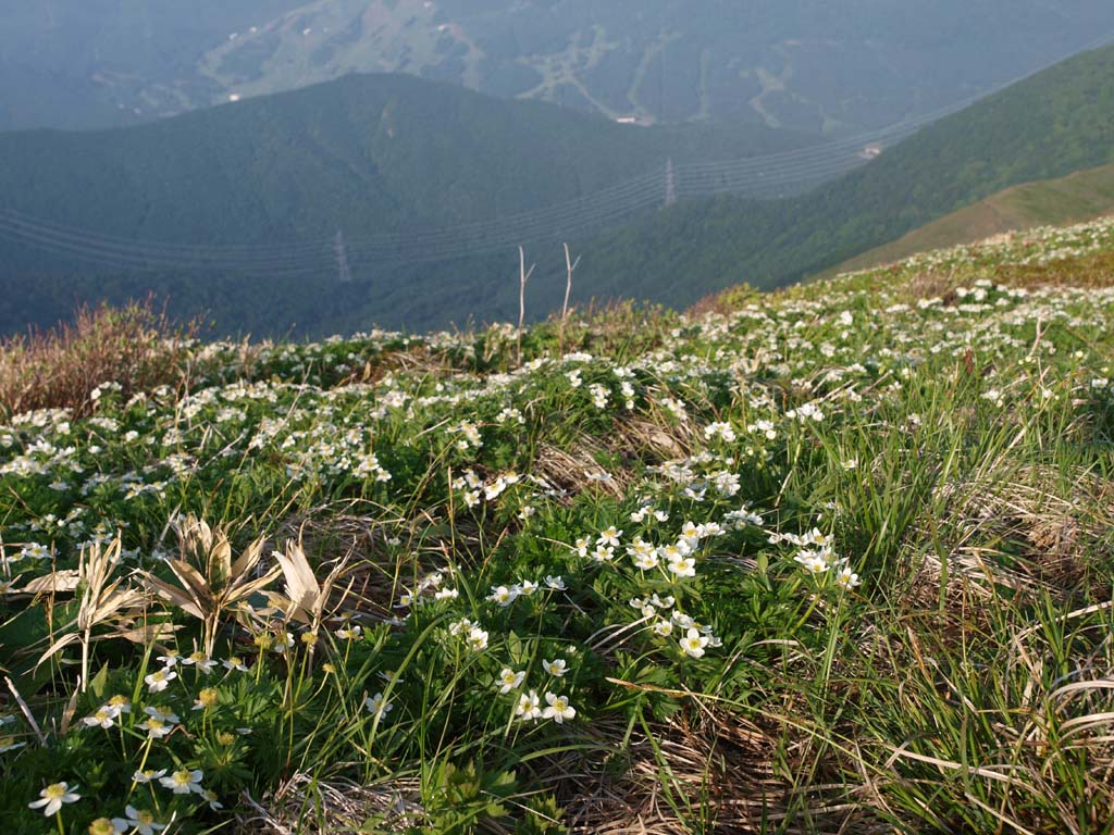 | ハクサンイチゲの群落。後ろには巨大鉄塔と送電線。この巨大鉄塔と送電線は苗場側にも走っています。 | 平標山山頂(1984m)。 | ハクサンイチゲとサクラソウ。 | 平標山を振り返ります。山頂の下にベンチも見えます。この登山道の両側がお花畑です。 | ひっそりと咲いていたシャクナゲ。 |