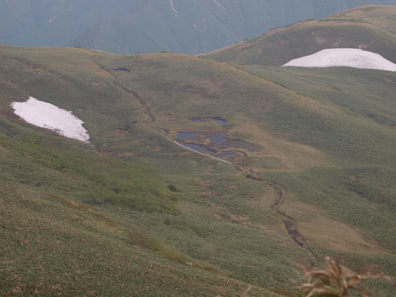 | 平標山山頂から降りてくる登山者たち。 | シナノキンバイ。 | 平標山頂から平標新道を見おろします。 | 平標山の家。 | コイワカガミ。 |