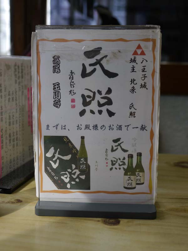 11時15分頃禾生駅に到着。駅員さんと頂上の様子やビッキーの消息などについて話しました。11時29分発の電車は、直通高尾行きなので便利です。12時20分頃高尾駅に着き、高尾での恒例玉川亭で一人打ち上げ。この日は天ざるつけとろ(1,500円)、吟醸酒氏照(800円)でした。この時期冷や奴(小仏の豆腐屋さん手作り)はないそうです。