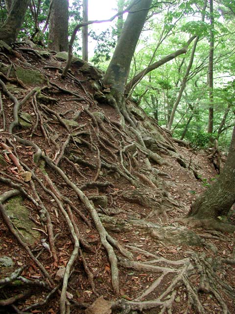 ここからは少し急な下りになります。また、最後の惣岳山の下はちょっとした岩場みたいな所もあります。ただ、前回の棒ノ嶺からの縦走のときに難渋した滑りやすい赤土の直登ルートは廃止され、その横に歩きやすい道が付けられていました。惣岳山(756m)は社があるだけで展望はありません。