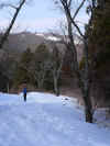 相模湖への下山路を見てみたら、あまりトレースがしっかりしていないようです。南斜面だし、足が雪に埋まって歩きにくそうなので小仏峠まで降りることにしました。城山までは踏み固められた道でしたが、城山から小仏峠まではこれまでと比べると少し悪路になります。でも、それほど困難な状態でもありません。逆コースで登ってくる人に、小仏へのバスの状況をきいたら、平常通りということなので、景信山から小仏に下りることにしました。バス便がなければ、小仏峠から小仏、さらにバス便があるところまで歩くか、いっそ明王峠まで行って相模湖に降りるかと考えていました。