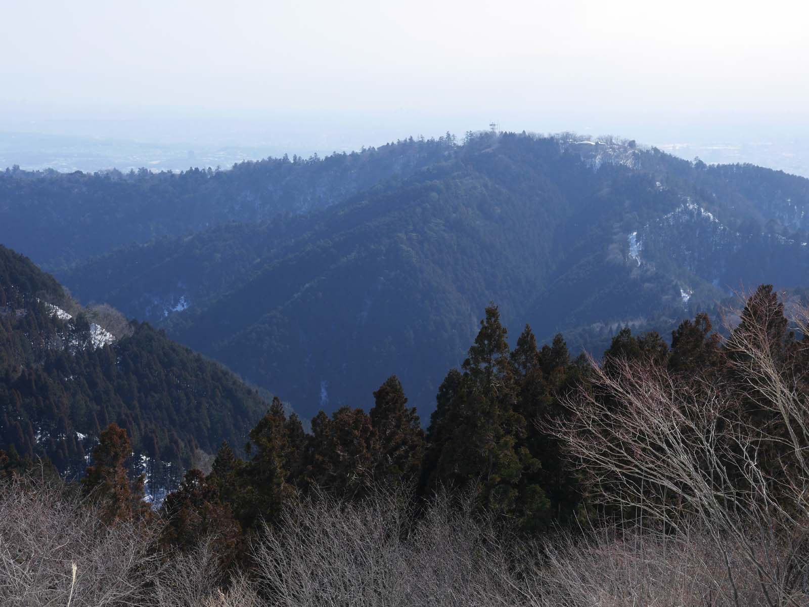 | 城山(パラボラがあるところ)が見えてきました。 | 一丁平の展望テラスから見る大山です。左は仏果山、高取山です。大山の拡大はこちら。 | 展望テラスから見る丹沢主峰群。相模川の河岸段丘もまだ雪景色です。 | 左は大室山。その右に富士山が見えるはずですが…。 | 人気のない城山頂上。茶店も営業していませんでした。 |