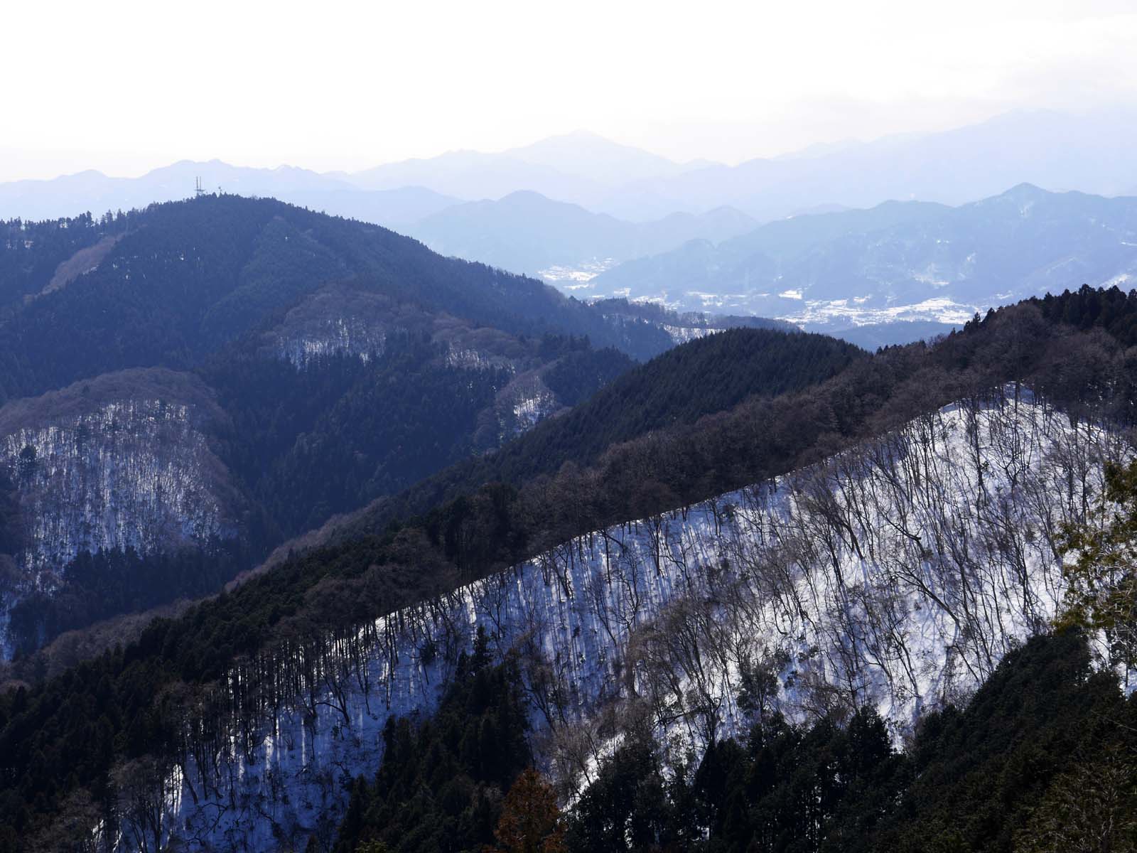 高尾山頂上(599.2m)には8時15分ころ到着。空気がもやっていてあまり展望はよくありません(富士山はまったく見えません)。それでも丹沢などは逆にそれなりの雰囲気がありました。意外とあっさり登れたので、小仏城山まで行ってみることにしました。道の状態がよくなければ、そのまま相模湖に降りればいいかと。