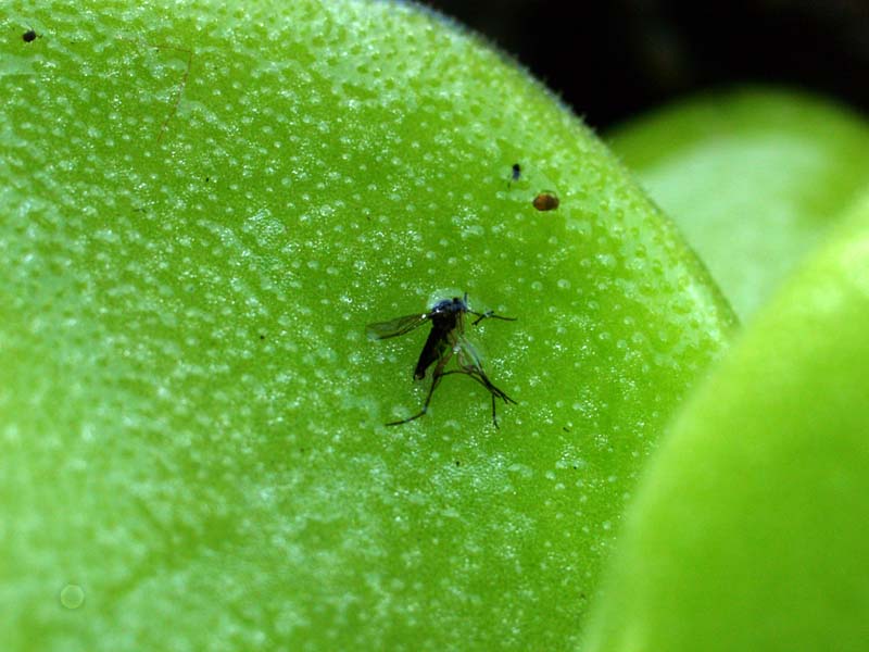 | ムシトリスミレの葉に小さな虫がついています。ヤモリの右前の葉など。2012年7月1日撮影。 | 手間の葉にも小さい虫がついています。奥の葉にも見えます。 |
