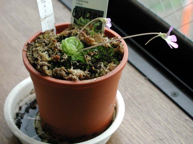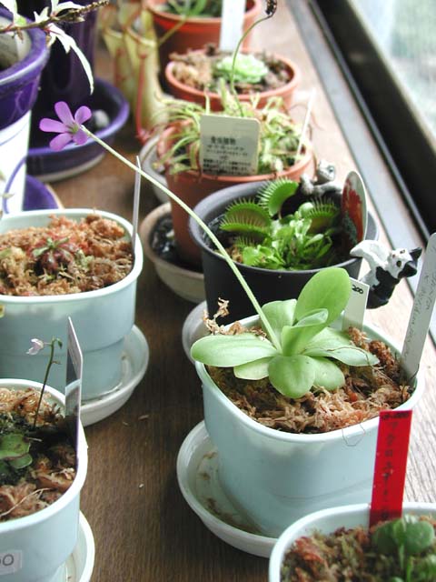 | ムシトリスミレは次々に花を咲かせる。ハエトリソウの花もやってきた。2004年5月。 | 葉がポロッと落ちたので、別の鉢においておいたら、それらしくなっててきました。こうやって増えるみたいです。2004年5月。 |