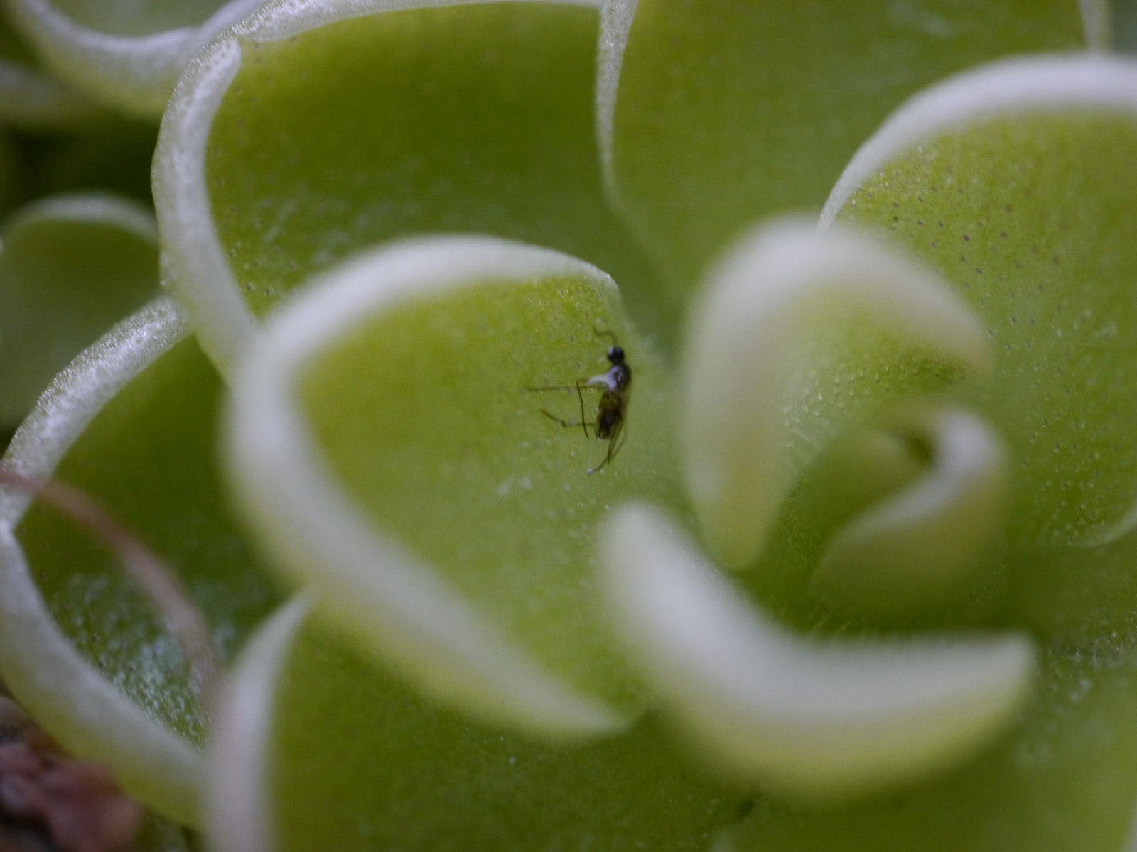 | こちらのムシトリスミレが花を付けました。2006年5月26日。 | 虫が葉に捕まっていました。 | |