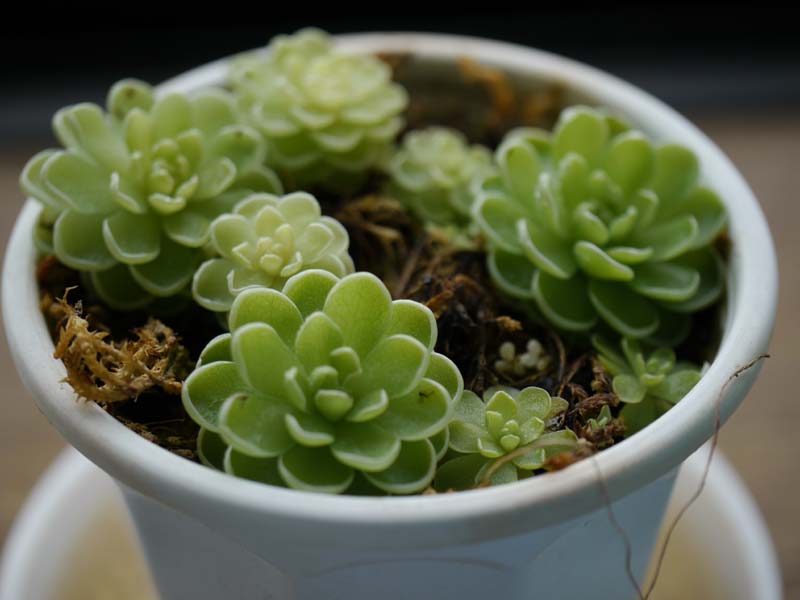 | 冬の真っ盛り、1月9日。ミシトリスミレが花をつけ始めました。まわりにはこぼれた葉が小さなムシトリスミレになっているのが見えます。 | |